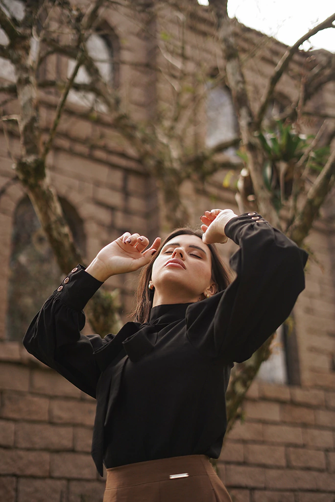 Delicada e sofisticada, a Camisa Luce carrega inspiração vitoriana em cada detalhe. As mangas longas franzidas na cava e o punho com franzido e três botões trazem um toque clássico e refinado. A gola alta reforça a elegância da peça, enquanto a pala nas costas, finalizada com prega em gota e botão, adiciona sutileza ao design. Acompanha uma faixa que pode ser usada para compor um laço, permitindo diferentes formas de uso — com ou sem o acessório. Com comprimento até o quadril, é versátil para produções que equilibram romantismo e sofisticação.