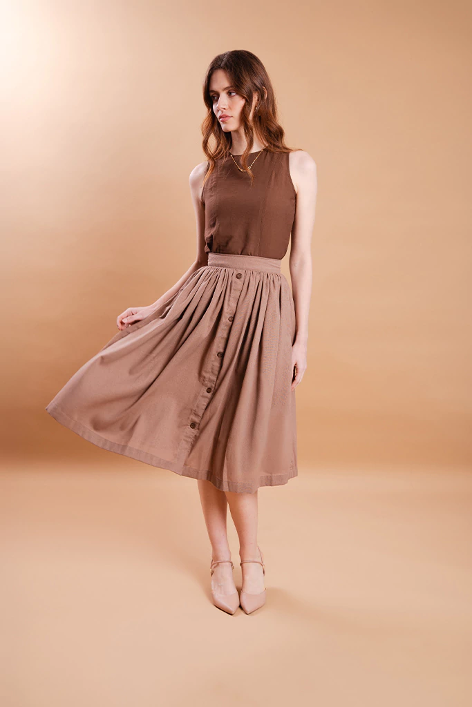 Com um charme natural e toque de sofisticação, a Saia Cervo Midi foi feita para acompanhar você em todos os momentos. Seu comprimento super midi traz elegância, enquanto os botões de madeira adicionam um detalhe rústico e único. A modelagem franzida valoriza a silhueta com delicadeza e movimento.
