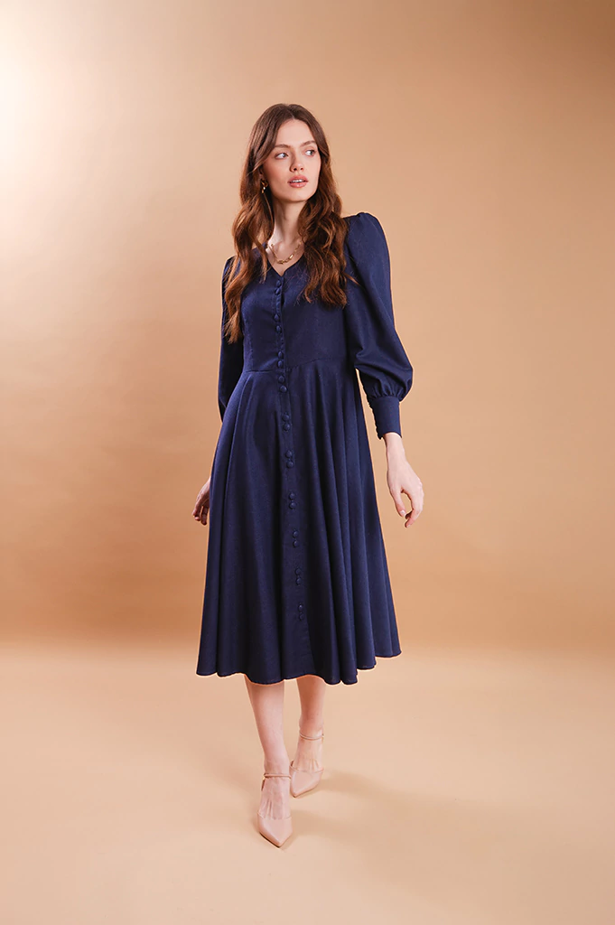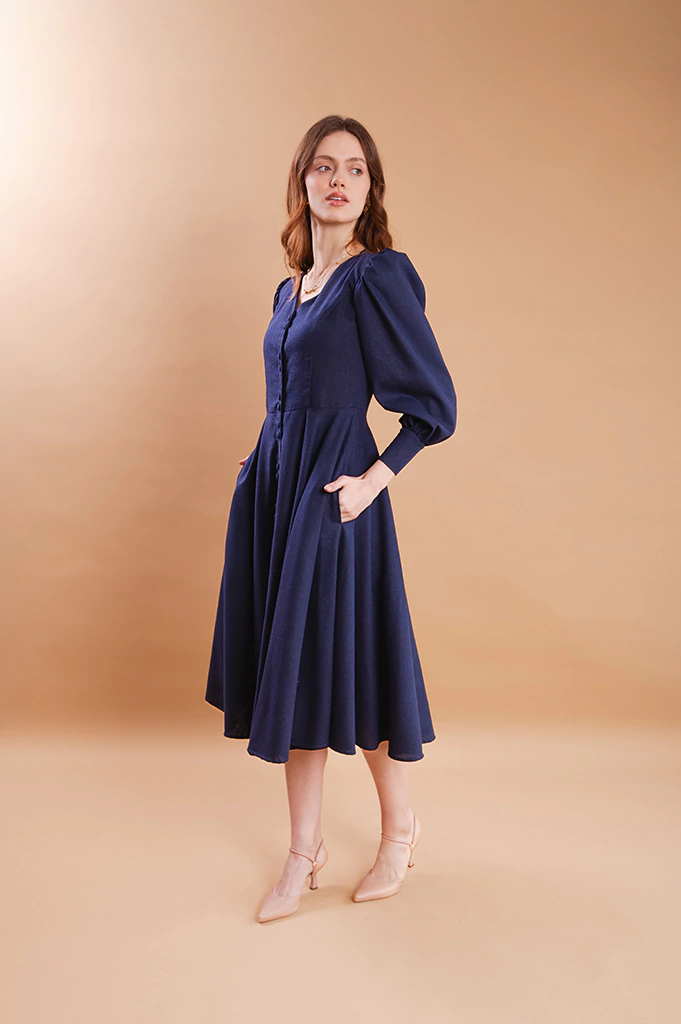 O Vestido Ava retorna em versão midi com modelagem godê, valorizando a silhueta com leveza e movimento. Possui bolsos laterais discretos, ideais para unir charme e praticidade no dia a dia.