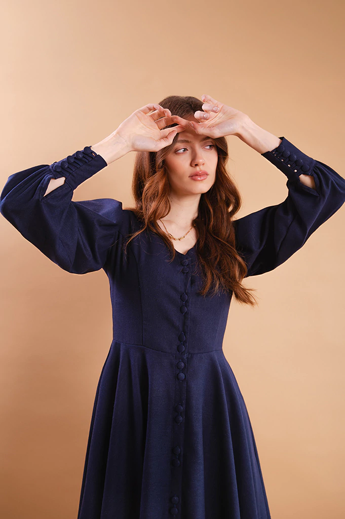As mangas longas bufantes com franzido na cava e no punho trazem um toque romântico e atemporal. O fechamento é feito por 30 botões encapados, distribuídos na abertura frontal e nos punhos com acabamento refinado.