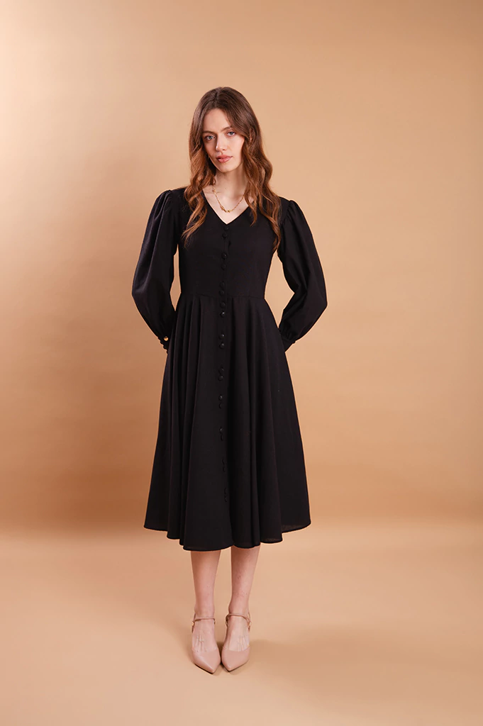 O Vestido Ava retorna em versão midi com modelagem godê, valorizando a silhueta com leveza e movimento. Possui bolsos laterais discretos, ideais para unir charme e praticidade no dia a dia.