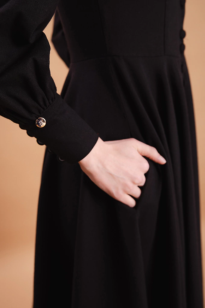 As mangas longas bufantes com franzido na cava e no punho trazem um toque romântico e atemporal. O fechamento é feito por 30 botões encapados, distribuídos na abertura frontal e nos punhos com acabamento refinado.
