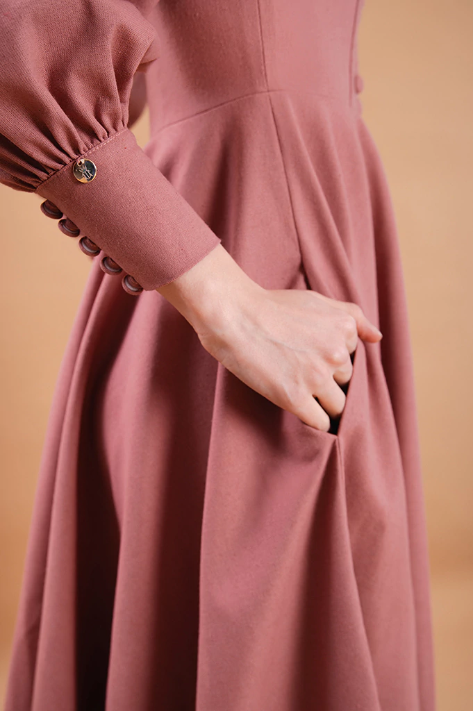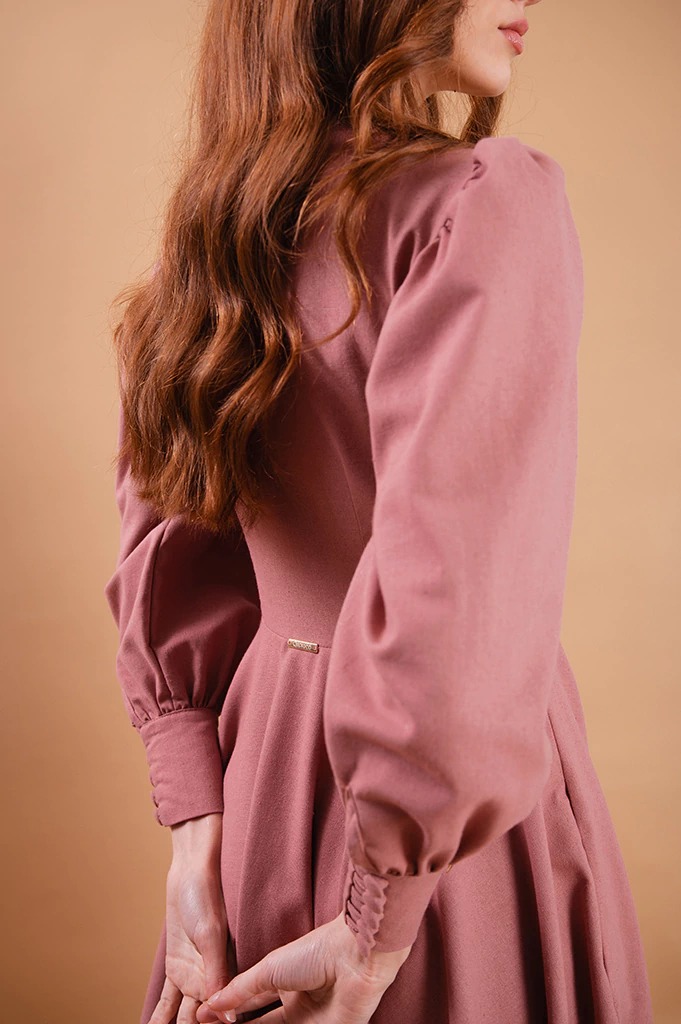 As mangas longas bufantes com franzido na cava e no punho trazem um toque romântico e atemporal. O fechamento é feito por 30 botões encapados, distribuídos na abertura frontal e nos punhos com acabamento refinado.