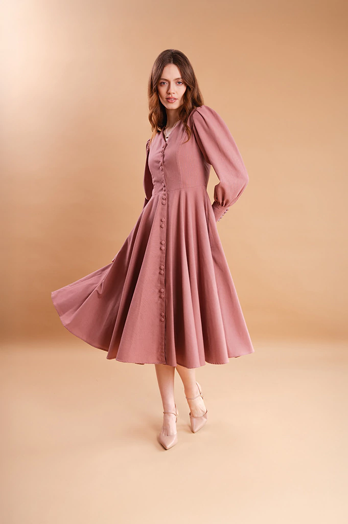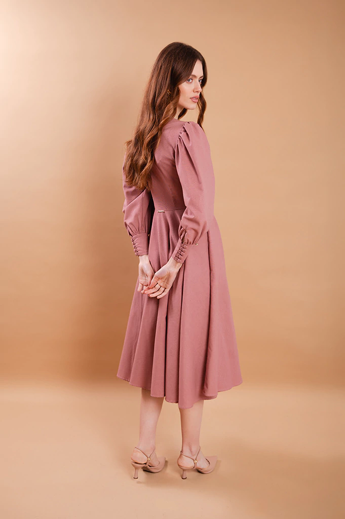 O Vestido Ava retorna em versão midi com modelagem godê, valorizando a silhueta com leveza e movimento. Possui bolsos laterais discretos, ideais para unir charme e praticidade no dia a dia.