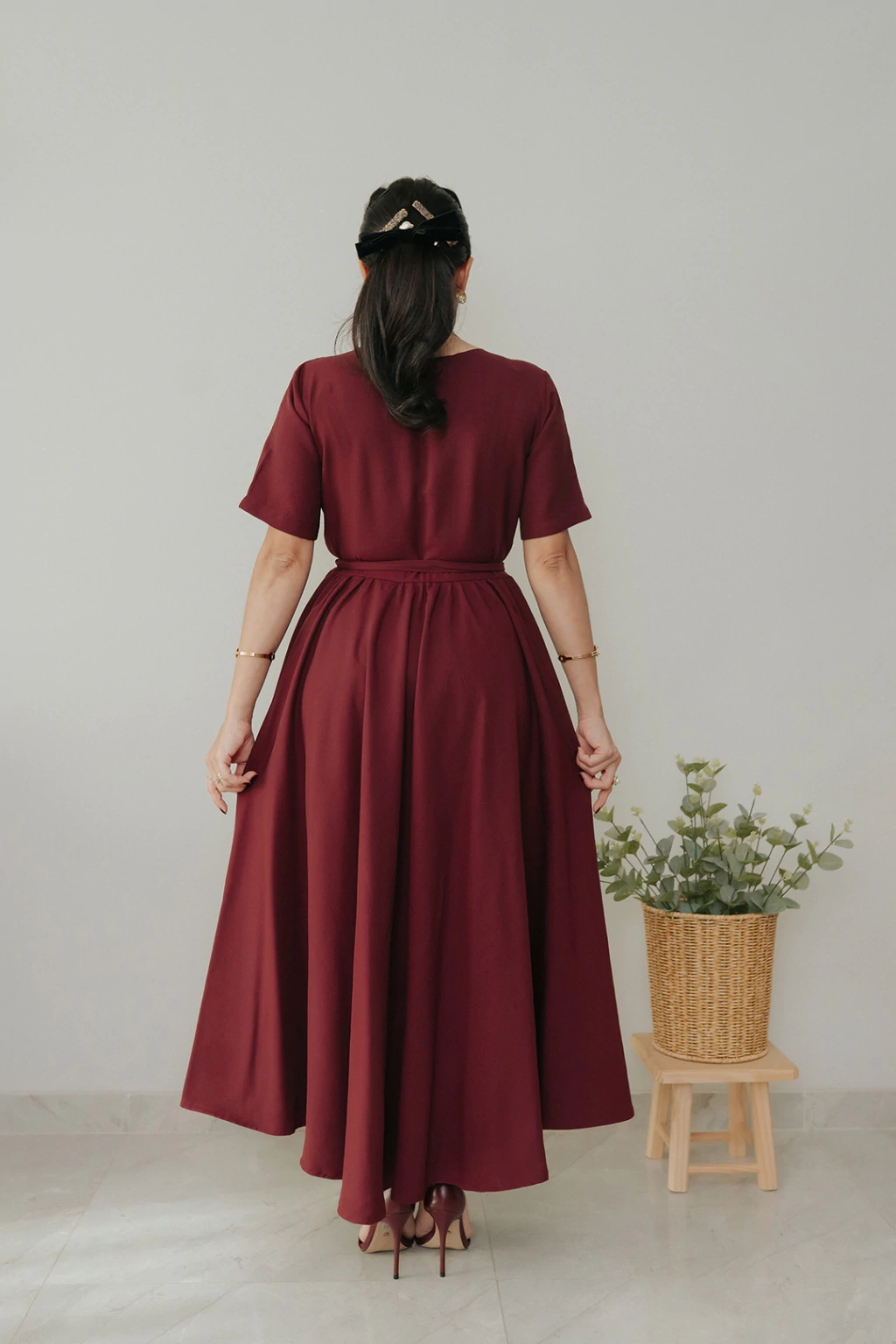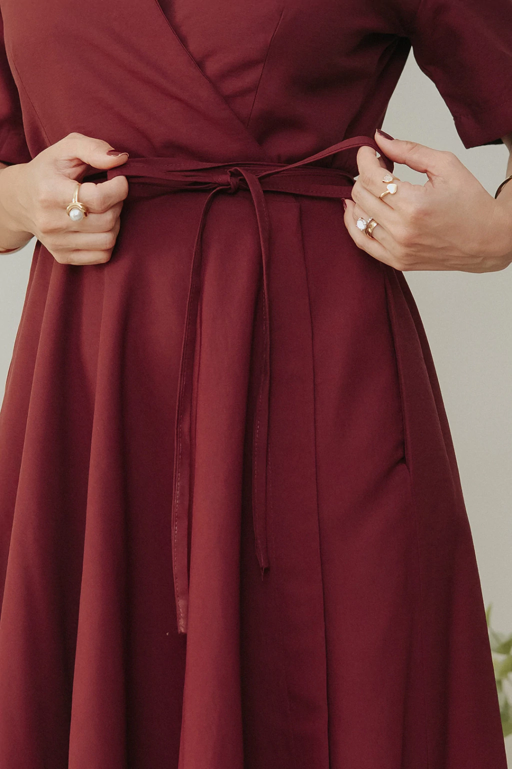 Esse vestido é puro charme com seu transpassado delicado e amarrações internas que se ajustam ao corpo com suavidade. A saia godê, ampla e fluida, oferece movimento e feminilidade em cada passo. O decote em V valoriza a silhueta, e os bolsos laterais embutidos trazem aquele toque prático que a gente ama.