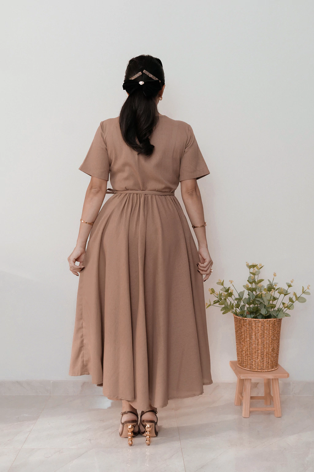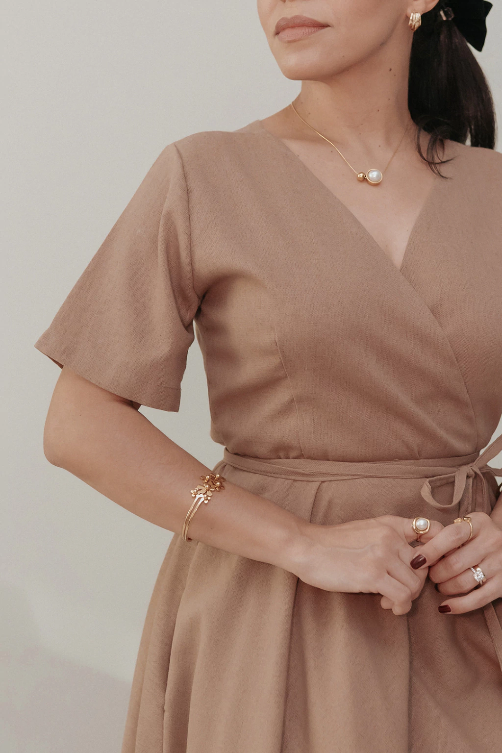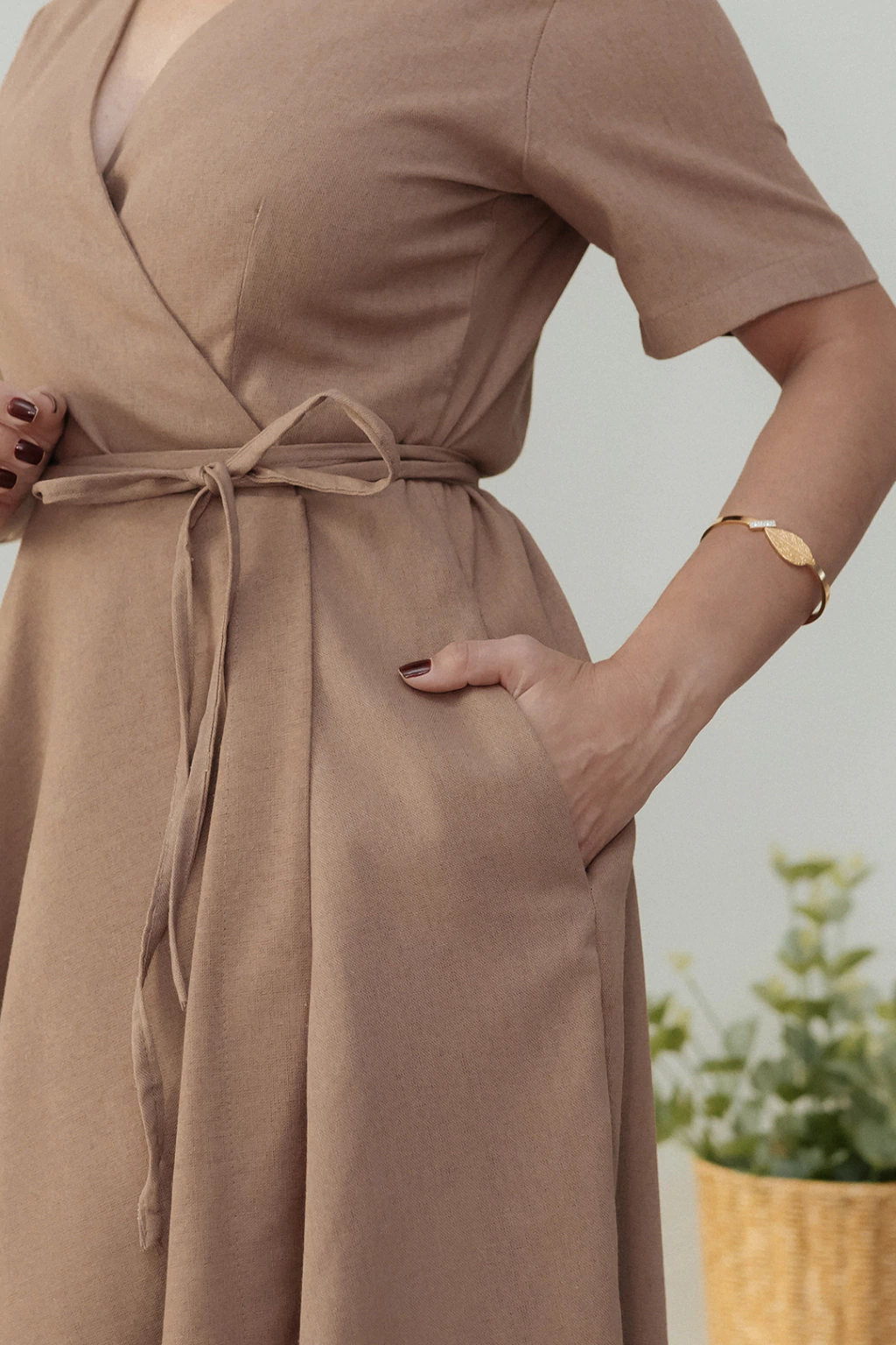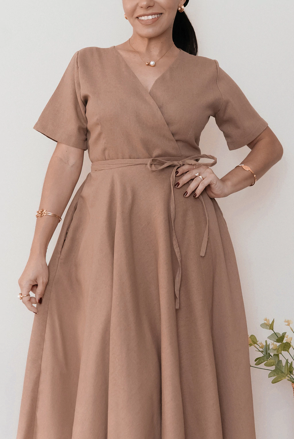 Esse vestido é puro charme com seu transpassado delicado e amarrações internas que se ajustam ao corpo com suavidade. A saia godê, ampla e fluida, oferece movimento e feminilidade em cada passo. O decote em V valoriza a silhueta, e os bolsos laterais embutidos trazem aquele toque prático que a gente ama.